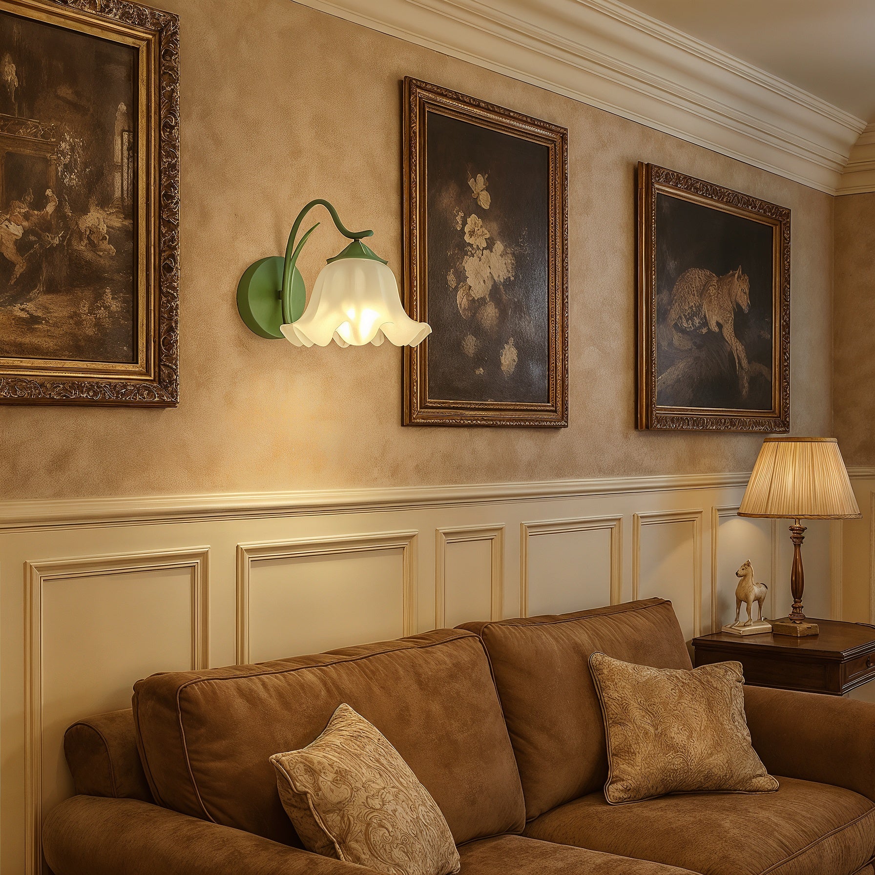 L’applique Amalfi séduit par son diffuseur en verre façonné comme un pétale de fleur, soutenu par une structure métallique colorée qui lui apporte une touche poétique. Elle diffuse une lumière douce et chaleureuse, idéale pour créer une atmosphère romantique dans une chambre, un salon ou un couloir.