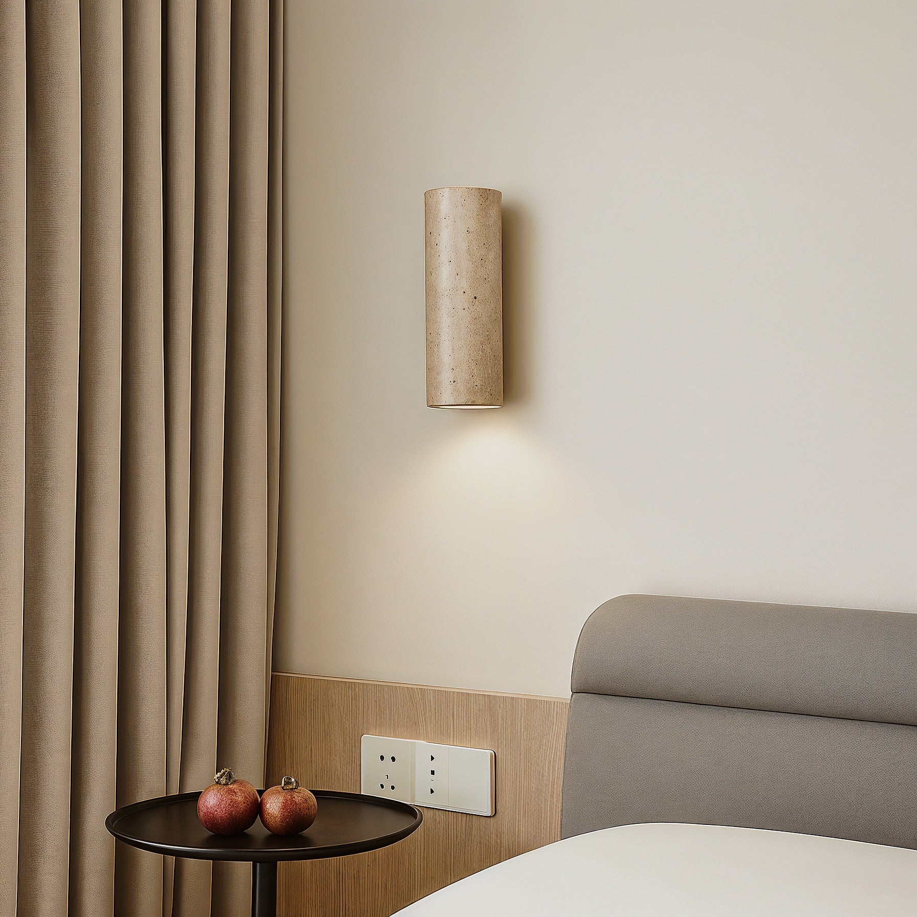 Cette applique murale en pierre naturelle et bois s’inscrit dans un style associant minimalisme et élégance brute.
