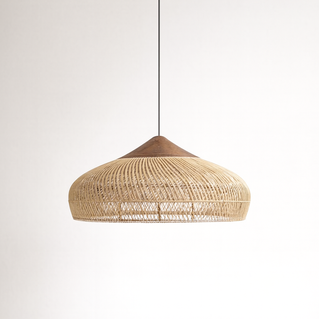 La suspension Cassis diffuse une lumière douce grâce à son abat-jour en rotin tressé à la main et son élégant capuchon en bois. Sa silhouette en dôme crée une ambiance chaleureuse qui met en valeur les matières naturelles : bois, lin, pierre ou travertin.