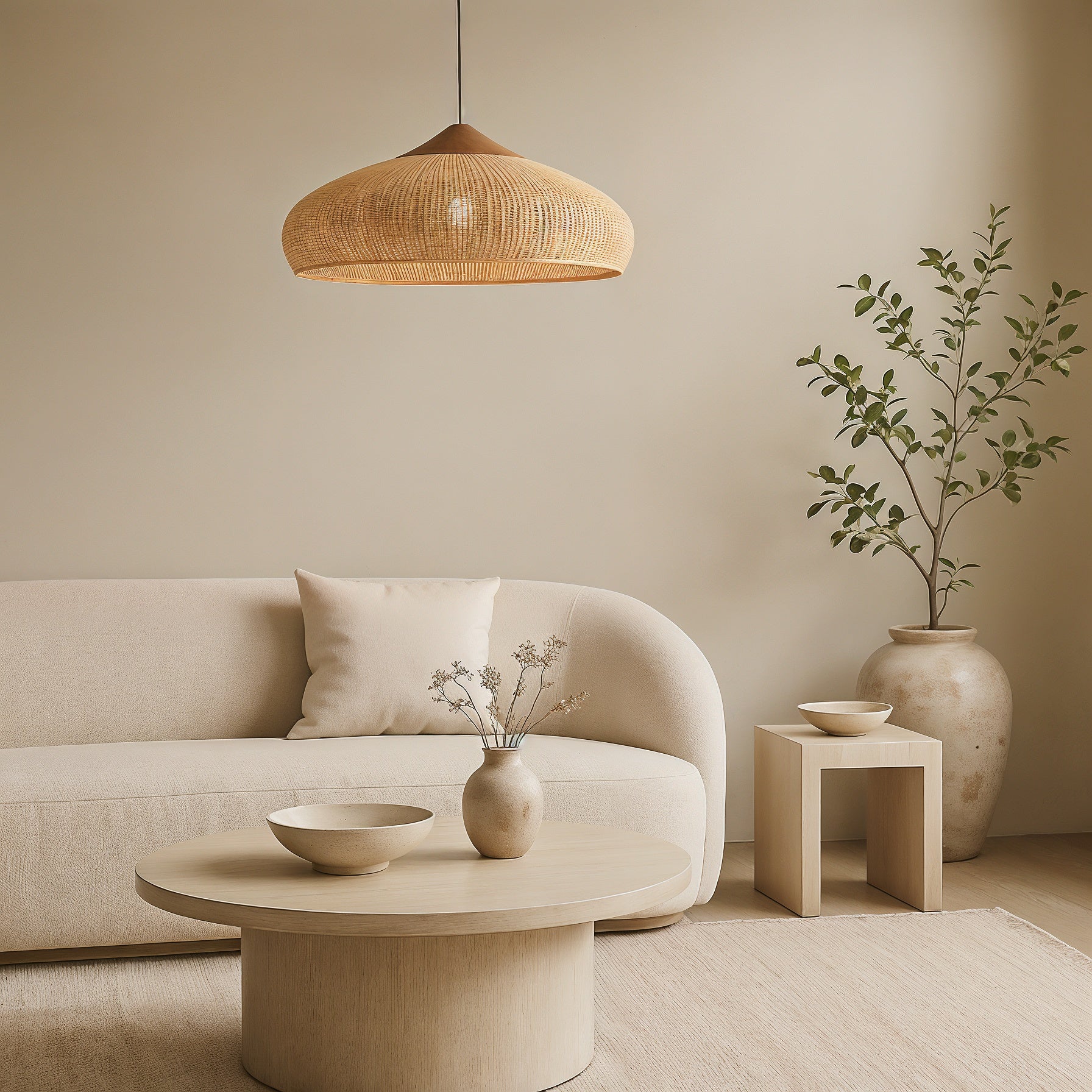 Design : suspension dôme en rotin tressé, style wabi-sabi