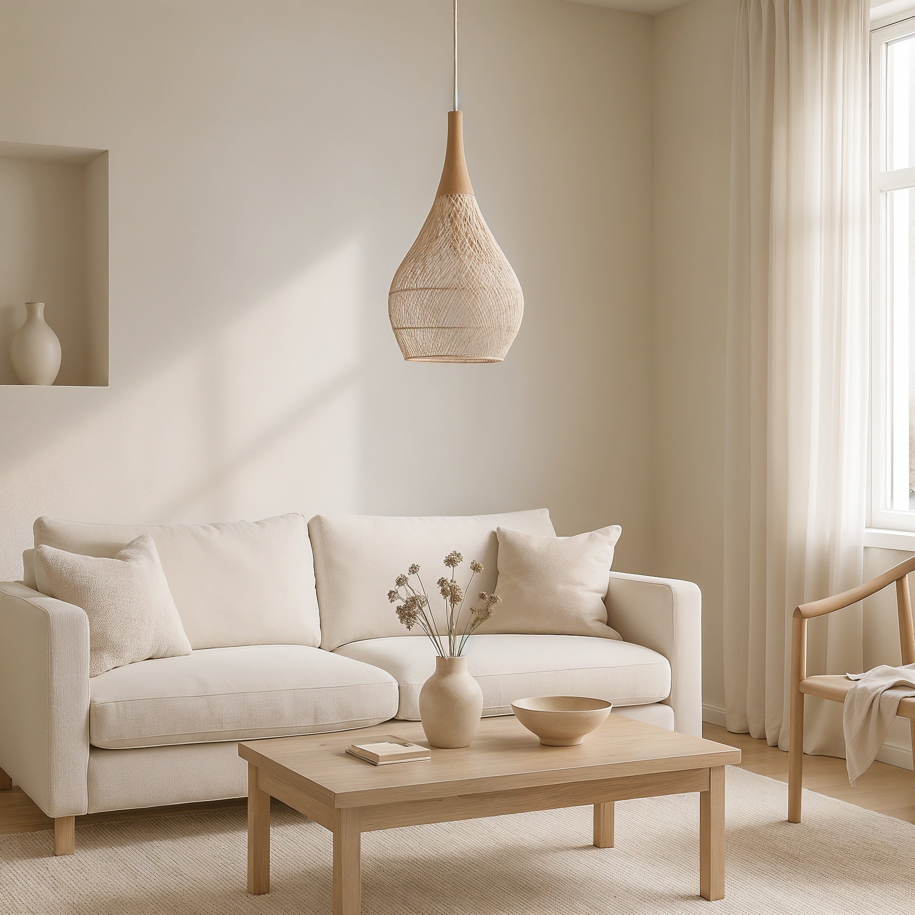 Design : suspension en rotin tressé à la main, silhouette goutte d’eau wabi-sabi